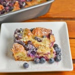 Place croissant pieces in a 9 inch square pan. Sprinkle with blueberries.