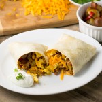 Assemble the burritos: Lay out a tortilla on a plate. Start with a generous spoonful of scrambled eggs, followed by desired toppings and finishing up with cheese. To wrap, fold in both sides and then fold the bottom up and over the ingredients. Roll up tightly.