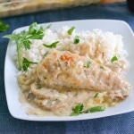 Pour mushroom sauce over chicken; top each piece of chicken with one slice cheese. Fold cheese in half if it is too wide for chicken piece.