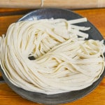 Using a sharp knife, cut the folded dough into thin noodles, varying the width to your liking (A dull knife will make it difficult to get thin noodles). Unfold each noodle, making sure to remove any extra flour.