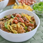 Transfer mixture to a rice cooker. Add water and reserved sauce; the rice to liquid ratio is 1:2. In other words, use 2 cups of liquid (water and sauce) for every cup of rice. So for 4 cups of rice, I added 8 cups of liquid (2 cups of reserved sauce plus 6 cups of water). Turn on rice cooker.