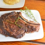 Transfer the steaks to a platter and discard the thyme sprigs. Cover loosely with aluminum foil and let rest for 5 minutes before serving.