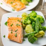 Remove the pan from the heat, let rest for 30 seconds and sprinkle the salmon with a good squeeze of lemon juice. Serve with the pesto vegetables.