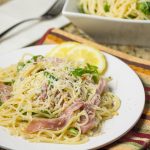 Add the juice of the lemon, butter, grated Parmesan and 1 cup of the hot pasta water to the large pot containing the pasta. Stir gently to combine, until creamy.