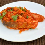 Add the tomato sauce and simmer for 1 minute. Add fish steaks and cook for 1 minute on each side. Sprinkle with cilantro and serve with rice.