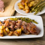 On a baking sheet, place the asparagus halves to the right and diced potatoes to the left. Toss the vegetables with the oil, salt, and pepper. Place the marinated pork in the middle of the baking sheet. Bake one to one and a half hours, depending on the weight of the pork.