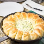Pre-heat oven to 375° F. with rack in center of oven. Remove bowl from center of skillet. Spoon prepared dip into the center space, pushing it right up to the edge of the dough. Sprinkle top of dip with additional mozzarella/Parmesan. Bake in the pre-heated oven for about 30 minutes, until rolls are golden and sound hollow when tapped and the dip is bubbly.