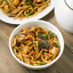 In same wok, heat remaining 2 teaspoons vegetable oil over medium-high heat; stir-fry mushrooms, garlic and ginger until mushrooms are beginning to soften, about 2 minutes. Add broccoli; stir-fry until tender-crisp, about 3 minutes. Stir in hoisin sauce, soy sauce, chili sauce and 3/4 cup water; bring to boil.