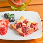 Add the strawberries, arranging in a single layer as much as possible. Sprinkle cream cheese pieces over strawberries. Bake for 45 minutes or until top is golden brown and edges are bubbling.
