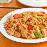 Add the onion and peppers halfway through cooking, stirring to coat with the sauce. Serve immediately.